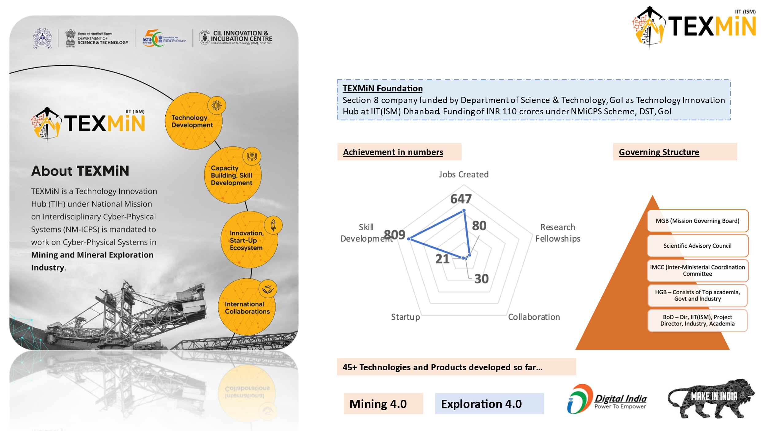 Founded the Technology Innovation Hub (TIH) in “Mining Technology” in the name of TEXMiN for developing technologies, innovation, and startup ecosystems in mining and earth science domains with substantial contributions from both Govt. and Industries