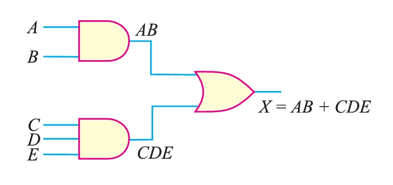 The logic circuit that performs the function \(X = AB + CDE\) is shown in Figure 1.