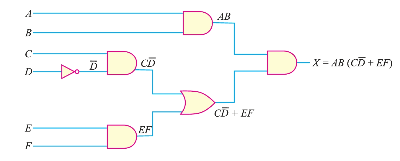 A breakdown of this equation shows that the term \(AB\) and the term \((C\overline{D} + EF)\) are ANDed. The term \(AB\) is formed by ANDing the variables \(A\) and \(B\). The term \(C\overline{D} + EF\) is formed first by ANDing \(C\) and \(\overline{D}\), ANDing \(E\) and \(F\), and then ORing these two terms. The logic gates required to implement \(X = AB (C\overline{D} + EF)\) are as follows :