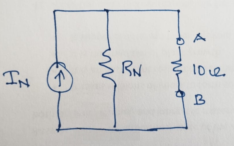 Find the current through the \(10~\Omega\) load resistance between \(A\) and \(B\) as given in the figure using Norton and Thevenin method.