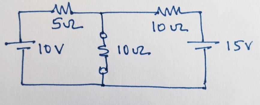 The first step using the Norton method is to remove the load resistance and short the terminal \(A\) and \(B\) and find the contibution of closed circuit current through terminals \(A\) and \(B\) for each of the voltage sources given. i.e., \(I_1\) for \(10~V\) and \(I_2\) for \(15~V\).