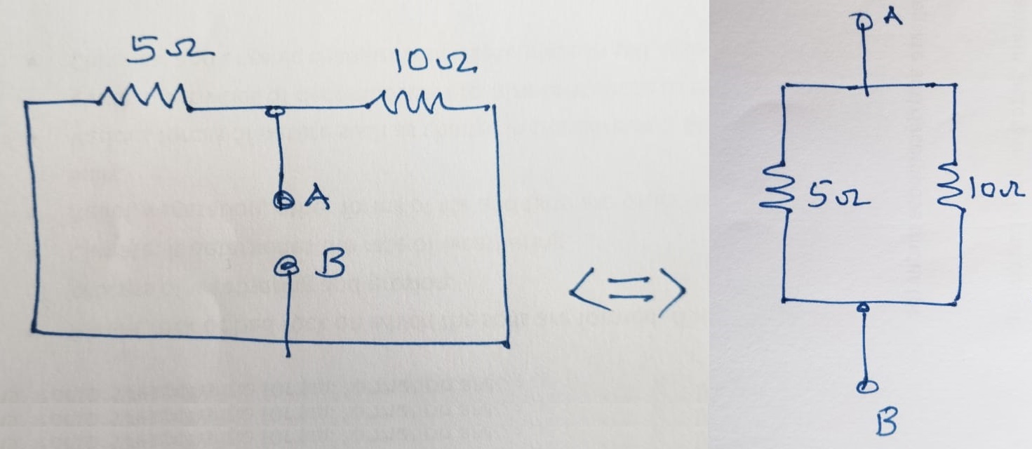 Hence the Thevenin equivalent of the network in figure (c). It is important to realise that the circuits of figures are equivalent only for measurements of current and voltage made at terminals \(A\) and \(B\), and nowhere else.