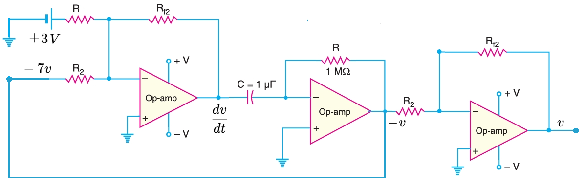 Three op amps are used, one as a summing amplifier, one as an integrator, and one as an inverting amplifier. The analog computer simulation was obtained by first taking the output of the integrator was chosen by choosing \(R = 1 \,\text{M}\Omega\) and \(C = 1 \mu\text{F}\), so that \(RC = 1 \,\text{second}\), which is fed back into the summing amplifier having two inputs. The first input is for the \(2 \,\text{V}\) dc input, and the second input is the feedback from the unity-gain inverting amplifier. The output of the summing amplifier will be fed into the integrator circuit.