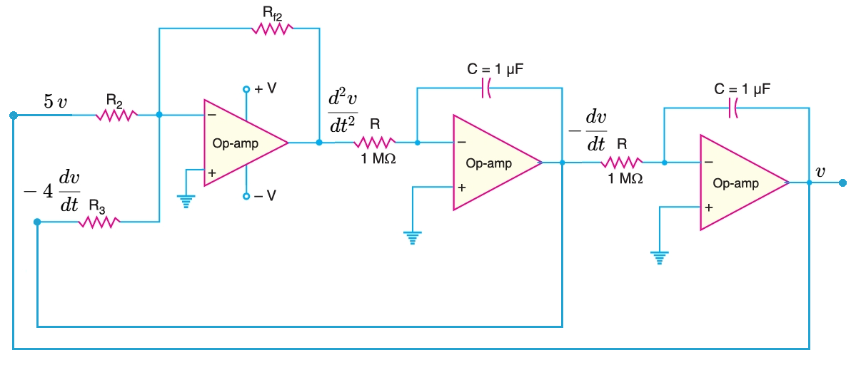 Operational amplifiers (op-amps) are versatile analog devices that can be configured to perform mathematical operations such as addition, subtraction, integration, and differentiation. By combining these functions, it is possible to design circuits that solve ordinary differential equations (ODEs) in real time. This approach is widely used in analog computers, control systems, and signal processing, making op-amps powerful tools in analog computation and system modeling. Solving differential equations with op-amps involves translating mathematical operations into circuit equivalents. Differentiators, integrators, summing amplifiers, and gain stages form the building blocks. By carefully designing the circuit, the real-time solutions to ODEs can be obtained.