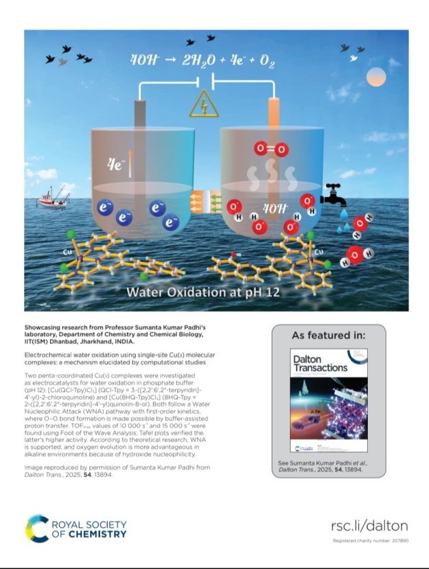 3. Raj, D.;  Makhal, K.; Raj, M.; Mishra, A.; Mahapatra, R.; Pattnaik, T.; Mallik, B. S.; and Padhi, S. K.* Electrochemical water oxidation using single-site Cu(II) molecular complexes: A mechanism elucidated by computational studies, Dalton. Trans., 2025, 54, 13894-13908(HOT Article and  Inside Back Cover)