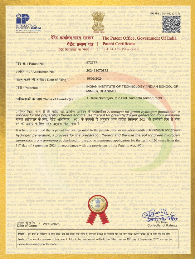 3. Natarajan, T.; and Padhi, S. K.*, A catalyst for green hydrogen generation, a process for the Preparation thereof and the use thereof for green hydrogen generation from ammonia. Indian Patent Application no. 202431070872, Patent Number: 572777, Filed on 19th Sept. 2024. (Status: GRANTED)